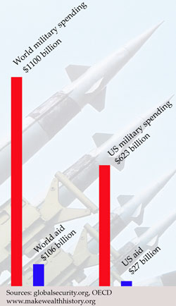 Military spending and foreign aid are almost opposites. Not only is one about life and the other about death, military spending actually creates the need for aid. So you might hope that we put more money towards development and aid than we do towards the means to kill, but in fact our priorities are completely upside-down.