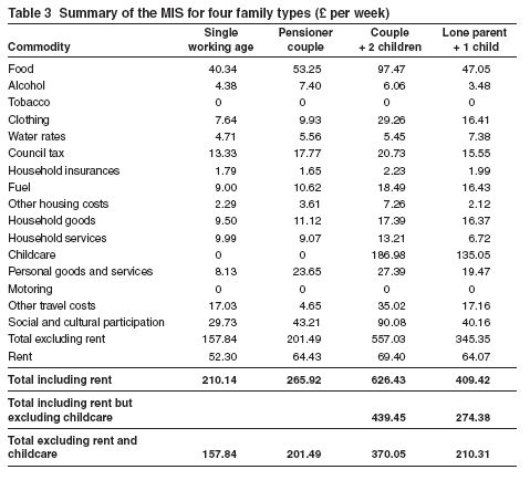 Working on solving poverty in the UK, the foundation wanted to ascertain the costs of a decent standard of living, so they could compare it to current welfare allowances. The sum they have come back with amounts to £210 per week for a single person, £626 for a couple with two children. See the table below for the breakdown of where that goes.