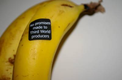 I’d suggest using the stickers on your friends first. Raid their cupboards when they’re not looking, and apply the labels appropriately. Start with products like coffee, tea, bananas, sugar, things where fairtrade versions are readily available, and there’s no excuse for not supporting them. Like this: