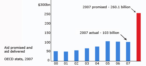 Having made our promises you might assume we’d be upping our contributions to meet the target. Sadly not. Levels of aid actually fell between 2005 and 2007. (The reasons for that are complicated, and mainly because 2005 was such a good year, but it still doesn’t look good). Last week’s summit in New York hoped to reverse that and get aid back on track. Here’s a graph of total aid given since 1990, and the ground we need to cover to meet our commitments.