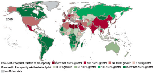 I find this map pretty stark. To put it simply, the red and pink countries are in overdraft on their natural resources. They rely entirely on the green countries, who are in credit on their resources, to provide them with what they need. Aside from Canada and Russia and a couple of other countries vast enough to offer a generous surplus of resources, the northern parts of the world are living off the south.