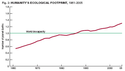 As you can see, we parted company with the earth’s capacity a while back. We’re now using renewable resources such as timber or fish 30% faster than the earth can renew the supply. We should all be familiar with what happens when you overshoot in this way, as WWF’s Director General James Leape writes in the introduction: