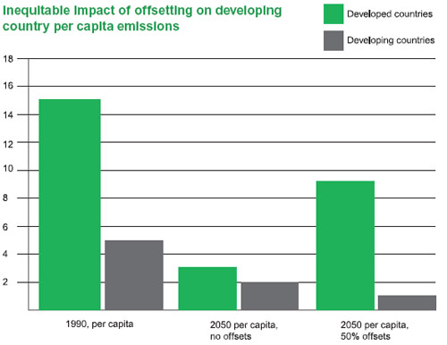 There are issues of justice at stake too. Poor countries should not be asked to refuse development opportunities so that rich countries can claim them as offsets. Nor should they be encouraged to refuse efficient but polluting energy sources such as coal, while richer countries get to carry on using them. As the graph below shows, offsetting allows the current inequality in emissions to continue long into the future.