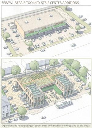 My own favourite is the ‘sprawl repair toolkit‘, which fills in the inefficient gaps between buildings. See how this drive-to shop becomes a precinct with a square? I’ve got a couple of sites in Luton begging for that treatment – yes, Toys’r’us, I mean you.
