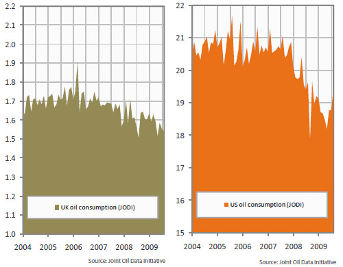 Here’s an interesting thing that I learned from Jeff Rubin’s book on the price of oil. As you may have noticed, oil prices rose to record levels last year and then crashed, only to begin their slow rise again. As the price of a barrel of crude has gone up, so demand has fallen accordingly in the developed countries. Here’s the UK and US oil consumption between 2004 and 2009, in millions of barrels a day:
