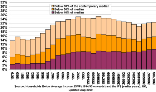 • Reading some politics into it, you might notice that poverty grew for 10 out of the 12 years of the Thatcher government, and the Conservatives only managed to finally wrestle poverty levels into a plateau before losing to Labour in 1997. Labour has, until recently, lowered the percentage a little. Lord knows I have no love for the Labour party, but their track record is a whole lot better when it comes to poverty, and I am yet to be convinced that Cameron’s party is sufficiently reformed.