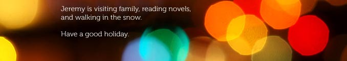 miscellaneousChristmas break by Jeremy WilliamsDecember 23, 2009December 23, 2010 Leave a Comment on Christmas break Just signing off for Christmas, and heading north to the Welsh borderlands to join the family. Enjoy the holidays, and I’ll be back in a few days… Jeremy Share this: Click to email a link to a friend (Opens in new window) Email Click to share on LinkedIn (Opens in new window) LinkedIn Click to share on Tumblr (Opens in new window) Tumblr Click to share on Reddit (Opens in new window) Reddit Click to share on Facebook (Opens in new window) Facebook Click to share on X (Opens in new window) X Click to share on Pinterest (Opens in new window) Pinterest Like Loading... Related