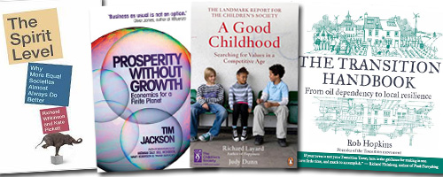 Time’s Up, The MoneyMaker, One Planet Living, Rekindling Community, The Hungry Spirit, How the Rich are Destroying the Earth, Water: Life in Every Drop, Localization: A Global Manifesto, Future Scenarios, Beyond Globalization, The Transition Timeline, The Long Emergency, Contraction and Convergence, Peak Everything, Hot Flat and Crowded, Crunch Time, Maxed Out, Seven Years to Save the Planet, Cutting Your Car Use, Lift the Label, Slow Tech, Workers of the World Relax, Renew the Face of the Earth. Among the other relevant books I didn’t review are Critical Masses, Better Off, and Twilight in the Desert.