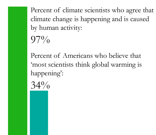 Sceptics will rejoice of course, but the simple fact is that 97% of climate scientists do agree that climate change is happening and is caused by human activity. Only 3% hold a different view, and most of those still know the earth is warming, and just favour a different explanation. The general public’s perception of the scientific community’s views is way off the mark.