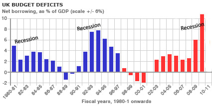 - In Osborne’s case it would be the latter, since his second statement was to lay the blame for the government’s financial straits squarely at Labour’s door. If Labour hadn’t overspent there would be no need for cuts, he suggested, as if the credit crunch had never happened. It’s true that we’ve been living beyond our means and government spending has been high, but the recession is a much bigger factor in our runaway deficit. Every recession sees tax revenues fall and spending increase as more people draw down benefits. There were recessions in the early 80s, early 90s, and the late 00s, and governments of both colours were forced to raise borrowing to compensate: