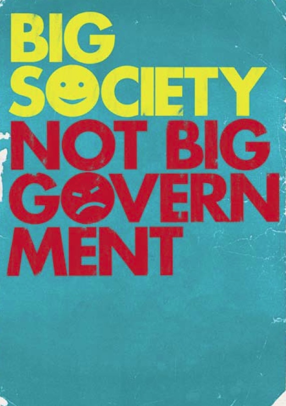 These narratives can be deconstructed. Who is being portrayed as heroic or villainous? What kind of imagery is being used? What sort of future is hinted at? I wasn’t going to give an example, but one spontaneously springs to mind in the form of Britain’s new coalition government: The drive towards small government is justified with the control mythology of “the inevitable budget“. Citizens and entrepreneurs are heroic, while civil servants and quangos are villainous. More government spending will lead us to financial ruin, while less will usher in a new age of aspiration. And the ‘big society’ posters, with their happy and frowning faces, have to rank among the least subtle propaganda posters of all time. It’s like the visual equivalent of the “four legs good, two legs bad” bleat that the sheep adopt in Animal Farm.