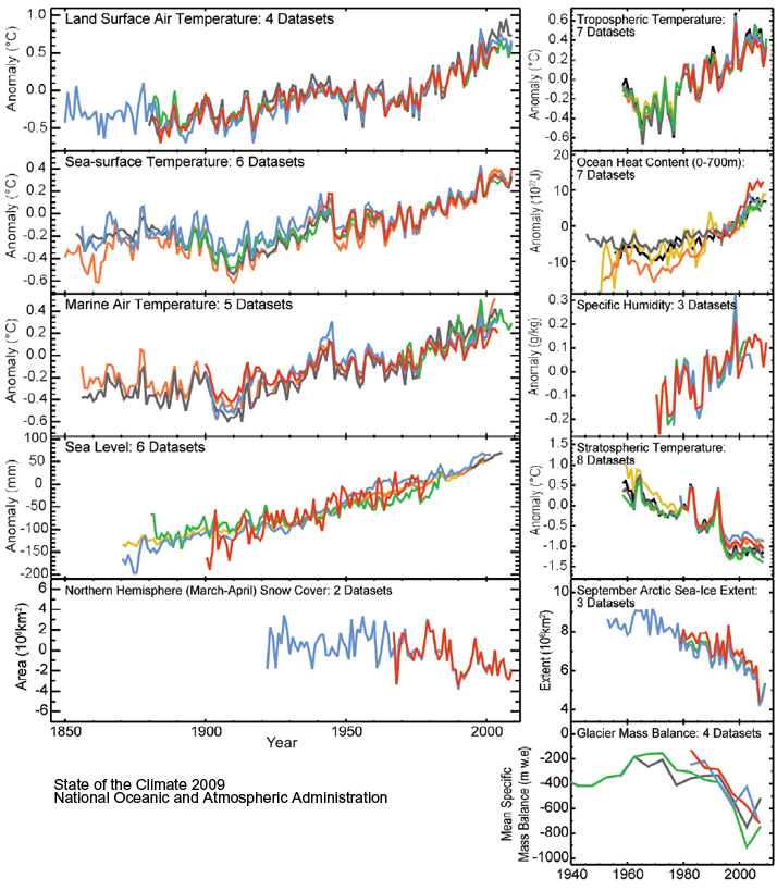 I can understand how some people might want to debate why the climate is changing, but denying the earth is warming at all is not a tenable position. Last week NOAA brought out their annual State of the Climate report for 2009. It uses more sets of data than any report on climate change before it. Here’s what it shows: