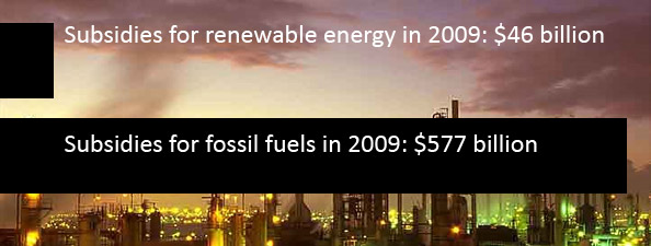 If you put together tax breaks, feed-in tariffs and other forms of government support, the renewable energy industry received between $43 and $46 billion last year, according to Bloomberg. If you add up similar support for oil and gas projects, the total comes to $577 billion.