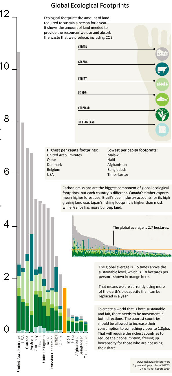 I do think if we are going to raise footprint concerns, raise the living standards of developing countries while lowering that of developed people are naturally going to ask why should more heavily populated nations get to have more resources just becuase they allowed their populations to get away from them. Not to forget the complicating factor of historical resource use.