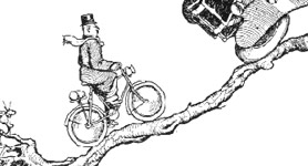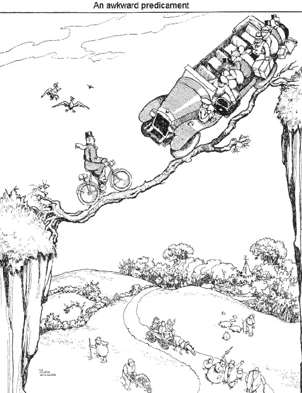 I’m not a pessimist by nature. I just feel a little like the cyclist in Heath Robinson’s surreal cartoon ‘an awkward predicament’. Here we are on a narrow bridge, unable to slow down or stop, and something rather large is coming towards us.