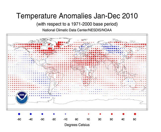 2010 has tied 2005 for the hottest year on record, according to NOAA. It will come as no surprise to the metorologists, who had predicted it. Neither will it suprise the countries that registered one of the 17 new record temperatures set last year.