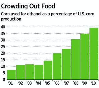 According to law, all petrol sold in the EU needs to include biofuels in the mix, currently 2.5%. It’s supposed to reduce our dependence on fossil fuels and lower our carbon emissions, but in a world where people are going hungry, diverting food into biofuels is hardly responsible. 40% of the US corn harvest now goes to biofuels, and the corn required to fill an SUV tank with biofuels could feed an adult for an entire year.