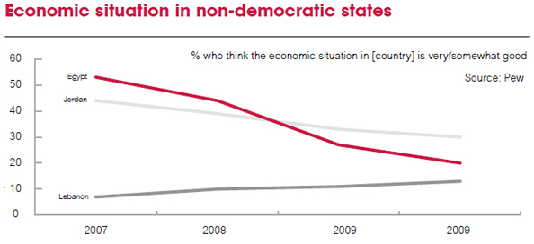 Today I was browsing the latest issue of IPSOS Mori’s Understanding Society bulletin. It features this graph, showing the economic confidence of Middle Eastern citizens over the years leading up to 2011’s wave of revolts.