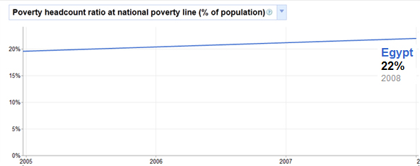 So the economy doubled in five years, and two thirds of Egyptians thought the economy wasn’t good? How is that possible? Perhaps this is a clue. This is the percentage of people living in poverty in Egypt, for the same time: