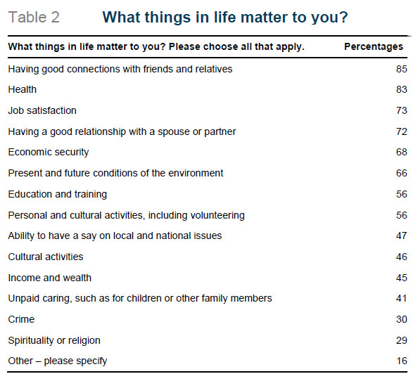 This week, we got to see some initial results. Top of the list of things we think are important are health, relationships, job satisfaction, and the quality of our environment. A sense of fairness and equality matters. Access to green space is important. Participation in culture and creative activities were mentioned, along with faith, and the way we use our time.
