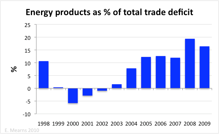 Energy imports are already a substantial percentage of our trade deficit (the graph here includes gas and electricity.) Would the benefits of getting to meetings faster offset the rise in oil imports? Since the price of oil isn’t going to come down any time soon, weaning ourselves off oil seems like a far more sensible thing to do for the economy.