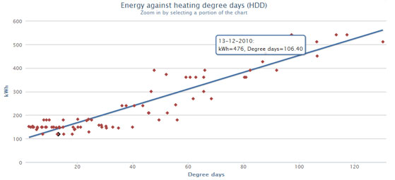 Correlation between outside temperature and energy use can be summarised into a single figure of efficiency, between 0 and 1. The UK average is 0.87, and the closer you get to 1 the better. My house comes in at 0.93, which is well above average but a way off the 0.97 that is considered excellent.