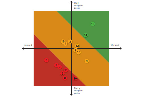 Several key commitments are languishing in the amber section, held up by funding cuts or by vague policies that don’t lead to action. That includes action on illegal timber, the protection of green spaces, and proposed legislation on water efficiency.
