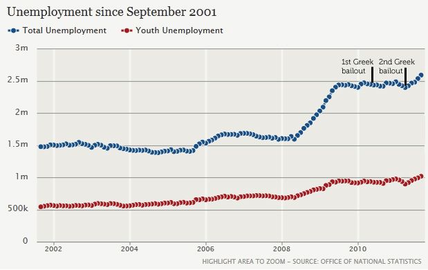 There’s absolutely no doubt that the crisis in the Eurozone is bad for the British economy, but our politicians are being somewhat disingenuous here. The simple fact is that we’d have high unemployment and a stalling economy with or without the crisis in the Eurozone. By way of evidence, Grayling claims that unemployment was falling, until the Greek situation began to deteriorate in July and turned it around again. That’s visible in the graph below, but you’d have to be misunderstanding government statistics, willingly or otherwise, to call that evidence that the Eurozone is responsible for our unemployment problem.
