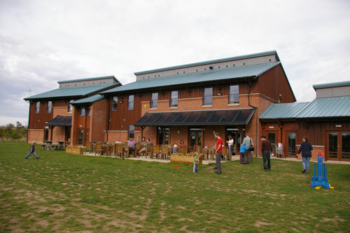 On the roof you can see a solar hot water system, and the heating runs off a biomass boiler which is fed with wood pellets from the National Forest itself. The roof collects rainwater and stores it in an underground tank beneath the building, and that is used to flush the toilets.