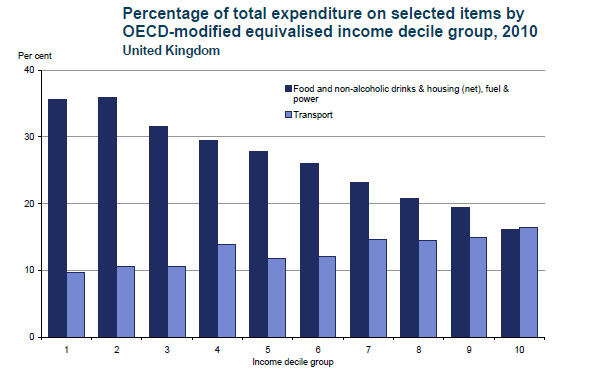 As the graph shows, poorer households spend a higher percentage of their incomes on essentials. Transport isn’t in that category. It rises with income, like spending on recreation and culture, or restaurants and hotels – it is a matter of discretionary spending.
