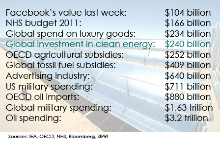 To transition from our fossil fuel addicted energy system to a clean and sustainable one, the world needs to find hundreds of billions of dollars every year. In 2011 global investment in clean energy was $240 billion. In a time of financial insecurity, say the critics, this is simply too much – we can’t afford it.