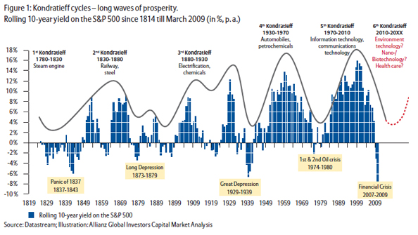 Still, some economists are revisiting the idea of Kondratieff waves at the moment. A new paper from the investment house Allianz suggests that we may be on the cusp of “the sixth Kondratieff”. Out of the current crisis could come a rising wave of new technology around renewable energy, biotech, nanotech and health.