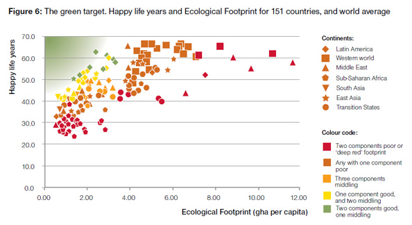 The graph below demonstrates these two directions. It plots countries by ‘happy life years’ on the vertical axis- a combination of life expectancy and reported happiness – on by ecological footprint on the horizontal axis. The ideal place to be is in the top left corner, with high standard of living and low environment impact.