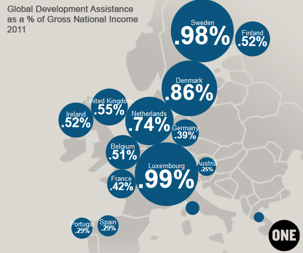 The EU countries have repeatedly pledged to increase their overseas development aid to 0.7% of gross national income. That’s a specific figure and isn’t plucked from the air – 0.7% of the developed world income is the estimated cost to fund the Millennium Development Goals. So how are we doing? Here are the results from 2011, from a rather nifty interactive dataset from One.
