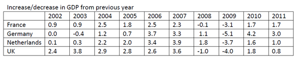 As you can see, Schipol and Paris have grown dramatically, while Heathrow and Frankfurt have grown more modestly. If hub airports are as important to an economy as the runway cheerleaders say, you’d expect this airport growth to be reflected GDP figures, right?