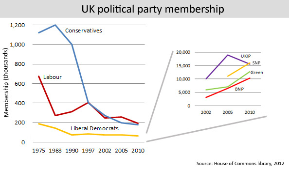 It isn’t that people can’t afford it. It only costs £25 to join the Conservative party, £12 to join the Lib Dems. It doesn’t appear to be a reluctance to join associations either, since other paid membership groups like the National Trust or the RSPB have grown phenomenally over the same time period. Some of it is down to switching allegiances, especially the rise of the SNP is Scotland, but the growth of the smaller parties doesn’t match the decline of the big ones.