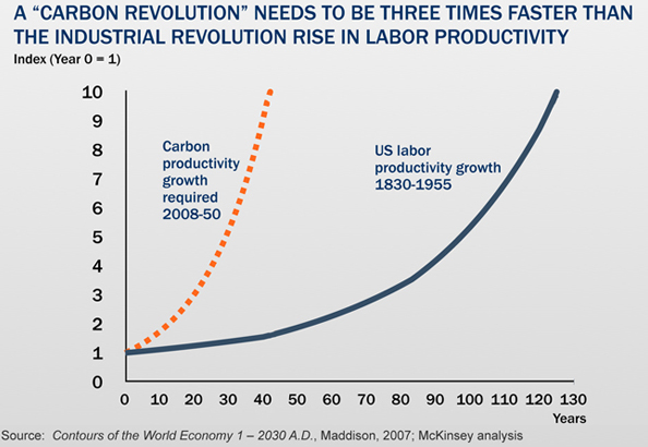 Writing in 2008, McKinsey calculates that the economy gets $740 of GDP for each tonne of CO2 equivalent. In order to keep the carbon content of the atmosphere below 500 parts per million, that ratio of dollars to carbon would have to increase tenfold by 2050. “This is comparable in magnitude to the labour productivity increases of the Industrial Revolution,” they admit, only carried out in a third of the time.