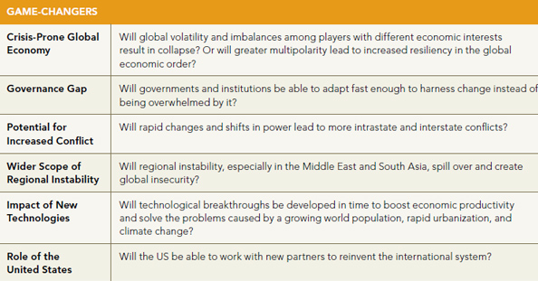 The NIC divides its forecasts into megatrends, which are likely to happen whatever we do, and gamechangers, which are less predictable possibilities. If you’ll excuse a somewhat rambling post, here are some highlights and impressions. First of all, here are the megatrends: