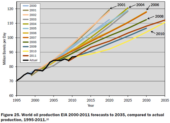 Here’s a comparison of the Energy Information Agency’s forecasts for the past decade, alongside actual oil production, as mapped by the Postcarbon Institute. (I’ve previously posted the IMF’s similar exercise) It suggests the agency has been wrong since about 2005, but perhaps is getting gradually more realistic in its expectations with each passing year.