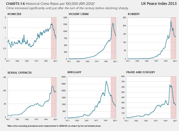 There are other sources besides the official ones however, and these can verify the trend. The Institute for Economics and Peace just published the first UK Peace Index, which ranks every borough in the country for violence. (Broadland in Norfolk is the most peaceful, Lewisham in London the least peaceful borough). Overall, violence has fallen by 11% in a decade. The institute admits that it was initially suspicious of its findings, and it cross-checked them against hospital admissions, police reports and the British Crime Survey, as well as other European countries. It is a fact: despite the recession, Britain is becoming more peaceful.