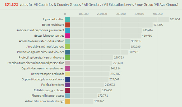Here are the survey results from the hundreds of thousands of people who took part in the MY World survey. People were asked to say which six out of sixteen issues would make the biggest difference to their lives, and here’s what they chose:
