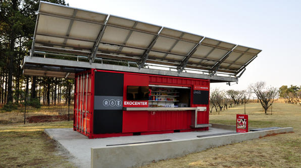 Called the EKOCENTER, one of these containers can be placed in a village and provide free drinking water. People can charge their phones, access the internet, store vaccines that need refrigeration, and yes, buy a coke. The shopfront can include a screen and a place to catch up with the news or watch the football, for those without their own their own televisions. They also provide employment, as each one will be run by a local entrepreneur, mostly women. They will receive business training and start-up loans, with the aim that EKOCENTERS run as financially sustainable social enterprises rather than hubs for charity services.