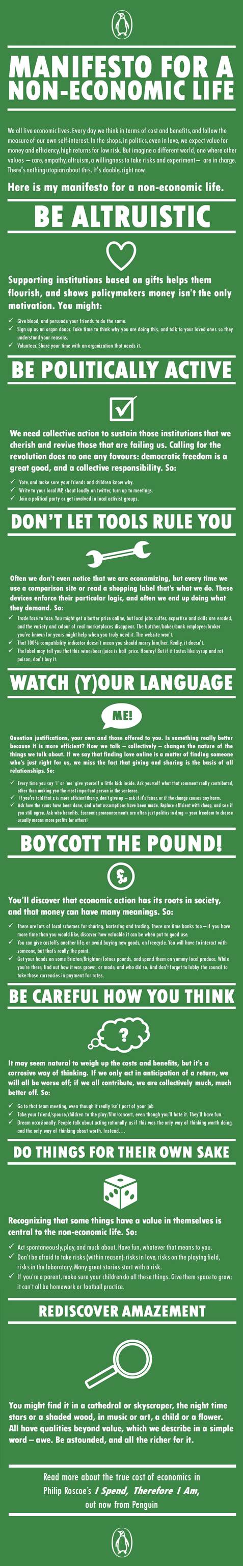 A couple of weeks ago I reviewed I Spend, Therefore I Am, by Philip Roscoe. It’s a serious book that deals with how economic language and modes of thinking has crept into everyday life, and what the consequences might be. Philip Roscoe’s guide to a non-economic life is not quite so serious, but it makes some great points. See what you think.