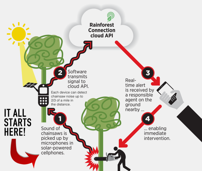 The project takes old smartphones and re-purposes them, weather-proofing them and fitting them out with solar panels. They are then hidden in tree tops in the forest, programmed to listen out for the sound of chainsaws. If they hear the distinctive sound of tree-felling in progress, they send an alert. Rangers can immediately respond.