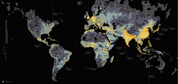 Of course, with images like these two above, the question that comes to mind is what it might look like if everyone had the same access to electricity or the internet. For that, you need a map of human population density.