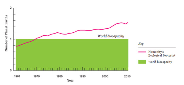It shows, in case you haven’t seen it before, humanity’s ecological footprint. That’s the red line, and it includes our drawdown of renewable natural resources such as timber and fish, and our use of the earth’s systems to absorb and process our waste.