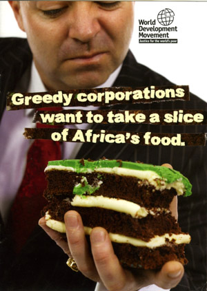 The covering letter has a picture of a large cake in the shape of Africa, which is then carved up, accompanied by quotes from King Leopold of Belgium. The enclosed campaign booklet, titled ‘Greedy corporations want to take a slice of Africa’s food’, has grotesque full-page photos of white people in suits cramming cake into their mouths. Crass would be an apt word, but it’s the series of assumptions that troubled me.