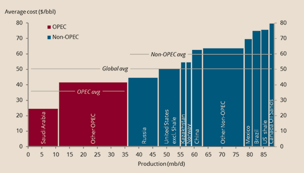 Today the WTI oil price stands at $55.91, which means those on the far right of the graph aren’t making any money. They tend to be the unconventional sources of oil, shale and tar sands. Saudi Arabia on the other hand, can produce oil very cheaply.
