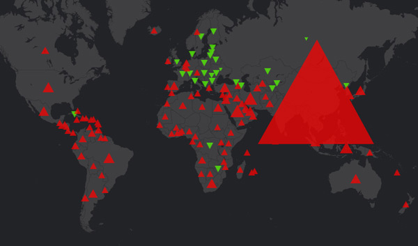 The mapping and information company ESRI have just released this rather striking image. It shows the change in carbon emissions by country since 1990. Green triangles show the countries that saw fall in emissions over that quarter century, thus meeting their Kyoto agreement targets. Red triangles show a rise.