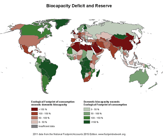 When you map the countries that run a biocapacity deficit and those that operate with a surplus, it looks like this: